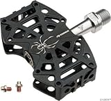 Tioga Spyder Platform pedals use a spider pattern that provides structural integrity while minimizing weight. The Spyder pedals provide narrow width and super low profile for optimal maneuverability for navigating through cityscapes, but combined with longer length for better stability and large platform comfort.Narrow profileCartridge bearingsNarrow profileChromoly axle with sealed bearings6061 T-6 CNC alloy bodyIncludes flat topped traction pinsItem SpecificationsColorBlackWeight240gIntended UseMountainMaterialAluminumPedal Spindle9/16"Spindle MaterialChromolyPedal TypePlatformDefined ColorBlack